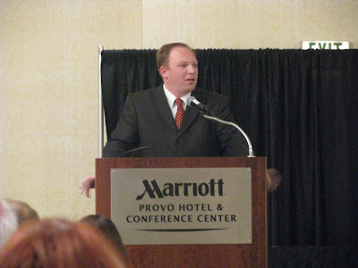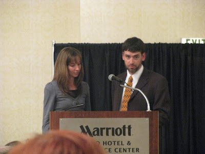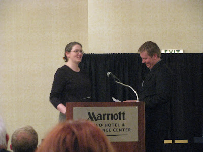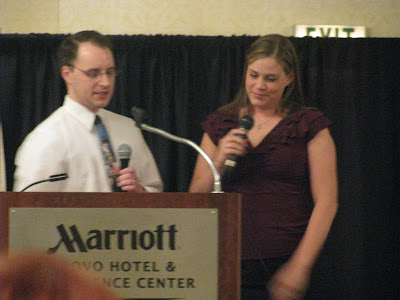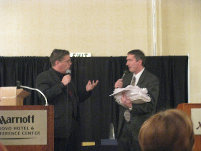 As promised, here are pictures from the Whitney Awards last month. And I should clarify the title of this blog—there is nothing wacky about the Whitney Awards. Rob Wells, as founder of the Whitney Awards and head of the committee the past two years, is all business (no pun intended Mr. recent MBA grad) and works hard to keep everything having to do with the awards both professional and ethical. But this past April he was a little busy with graduation and everything. In fact, Rob’s graduation was the same day as the Whitney Awards Banquet. Talk about being double booked . . . which is probably why Rob left it up to the presenters to do their own thing. Note to future Whitney presidents: This may not be the best idea. Unless, of course, you want wacky. Which is exactly what happened—all night long. Save for the classy duo of Annette Lyon and Angela Eschler, every single presentation was, well . . . goofy. It seems that as writers, most of us found it beyond our abilities to simply read the finalists and present the awards. We felt compelled to write, at times stretching the titles in our respective categories to the absurd. But, hey, we had fun!