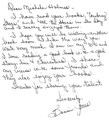 (reader emails are equally thrilling, I assure you), it was a very big deal. It arrived at the end of a couple of hectic, stressful days—days I had literally no time to write anything at all, days I wondered why I put the stress of one more thing (my looming deadline) on my already full life plate. Bonnie Jones’ letter was the uplift I needed, all the reward a writer can ever hope for, and I thank her for taking the time to send it to me.